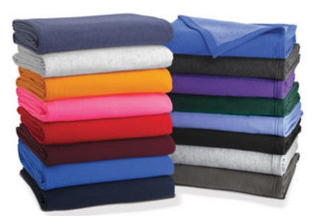 Blanket colors are available in Athletic Heather, Black, Dark Green, Gold, Maroon, Navy, Neon Pink, Purple, Red, Royal
