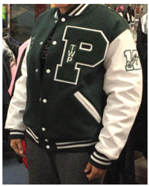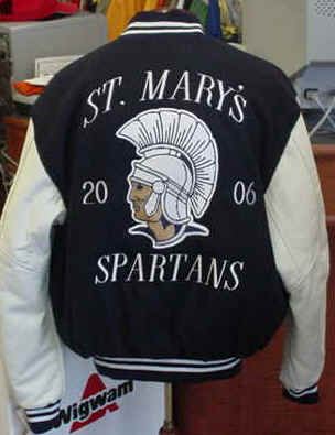 Custom Lettering for your Wool Body and Genuine Leather Sleeve Varsity. The School Name and Sport can be embroidered in a variety of colors.