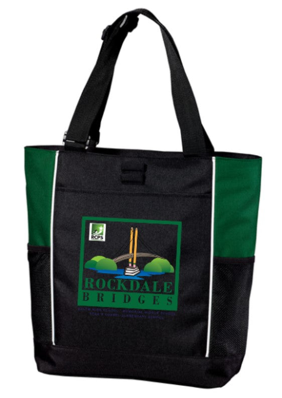 600-denier polyester, Zippered opening, Large front pocket, Adjustable web handles, Pen holder loops, Two side water bottle holders. Size approximately 14.875"h x 12.75"w x 5.125"d