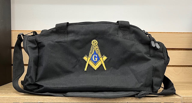 Front pocket and two side zippered pockets. Separate pouch for shoes. Adjustable, detachable padded shoulder strap. Standard designs are for lettering on the back side. Additional lettering available on top, both end pockets and hand grip.