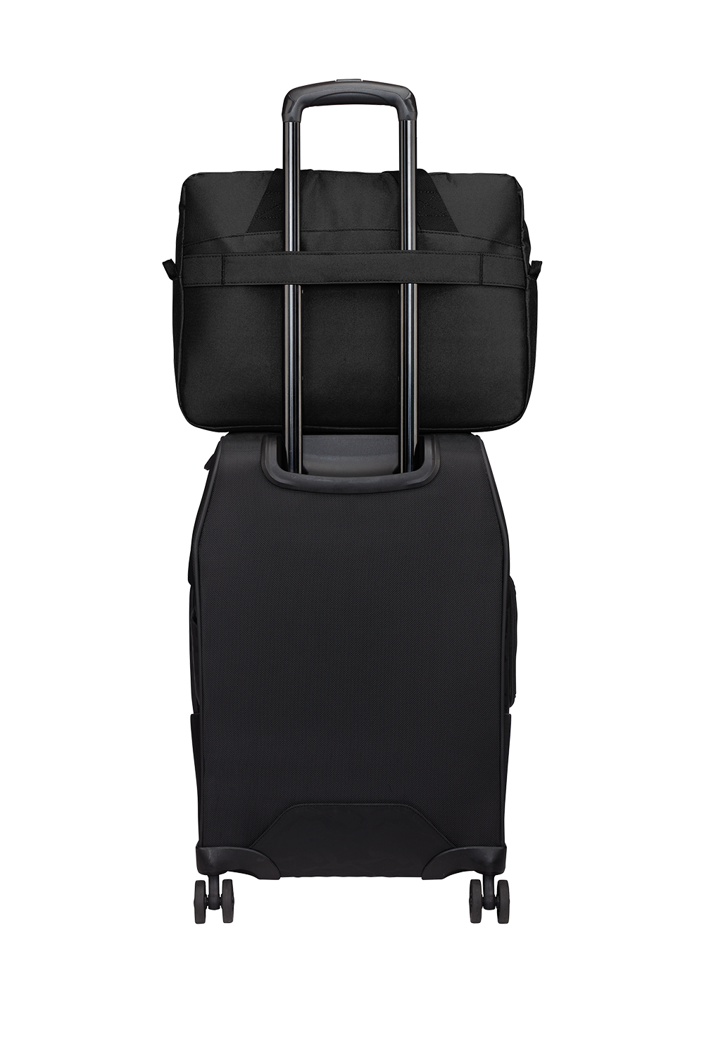 Large zippered main compartment • Interior padded laptop compartment • Front zippered pocket with interior organization panel • Removable, adjustable, padded web shoulder strap • Metal zipper pulls • Web handles • Luggage trolley pass through on back • Laptop sleeve dimensions: 8”h x 15”w x 1”d; fits most 15” laptops